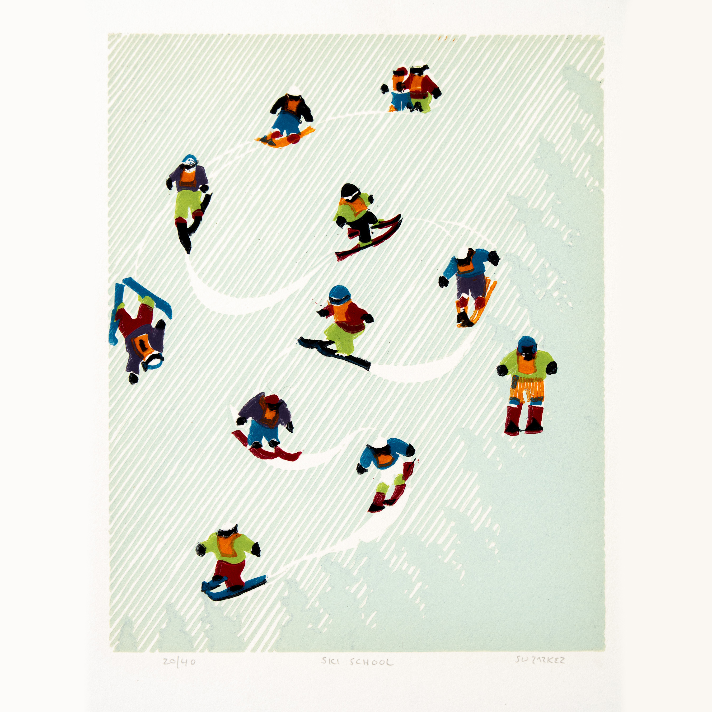 ski school linoleum block print in 7 states image size 12" by 9" ED 40