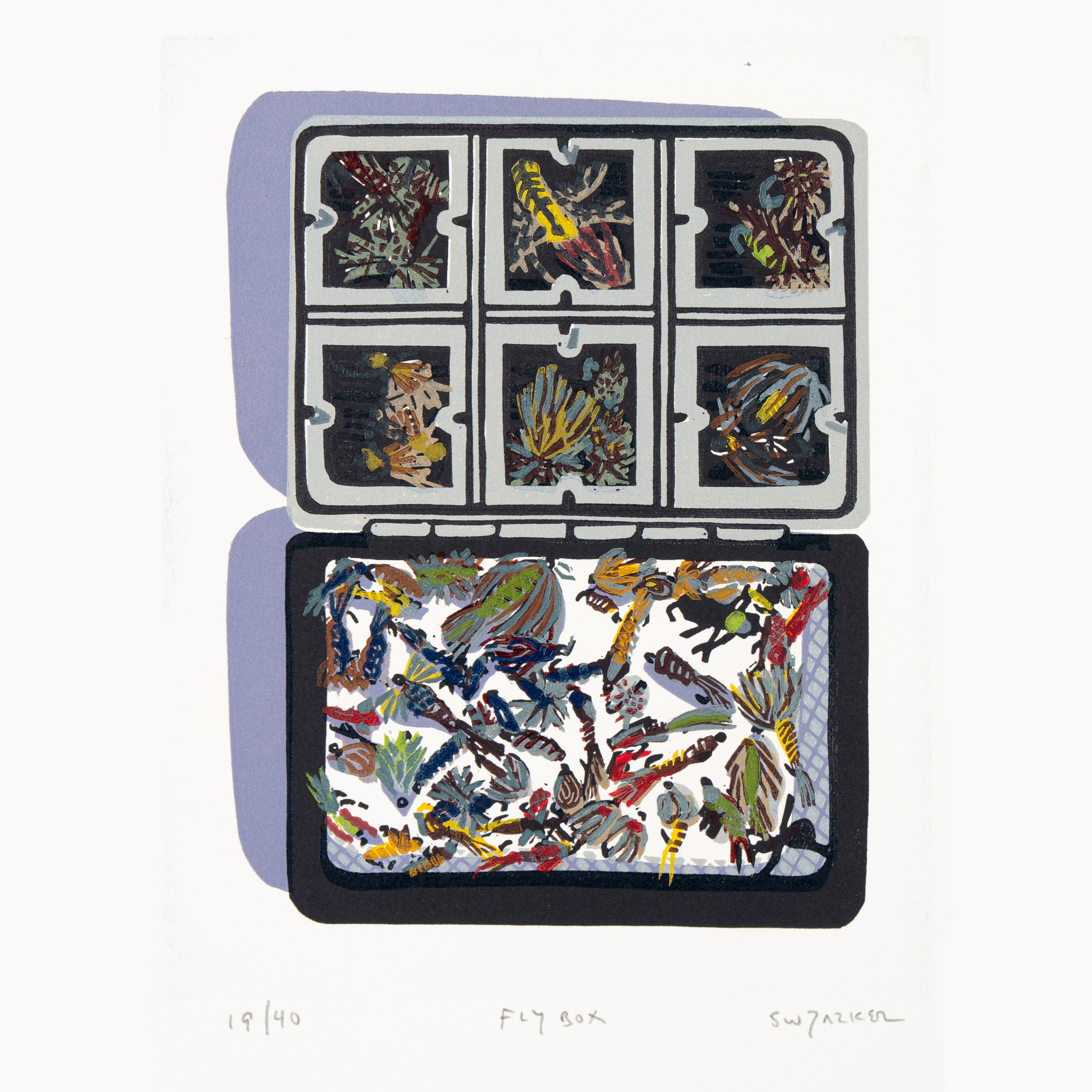 FLY BOX linoleum block print 8 states/ 8 blocks image size 10" by 8" paper size 13" by 11" ED : 40