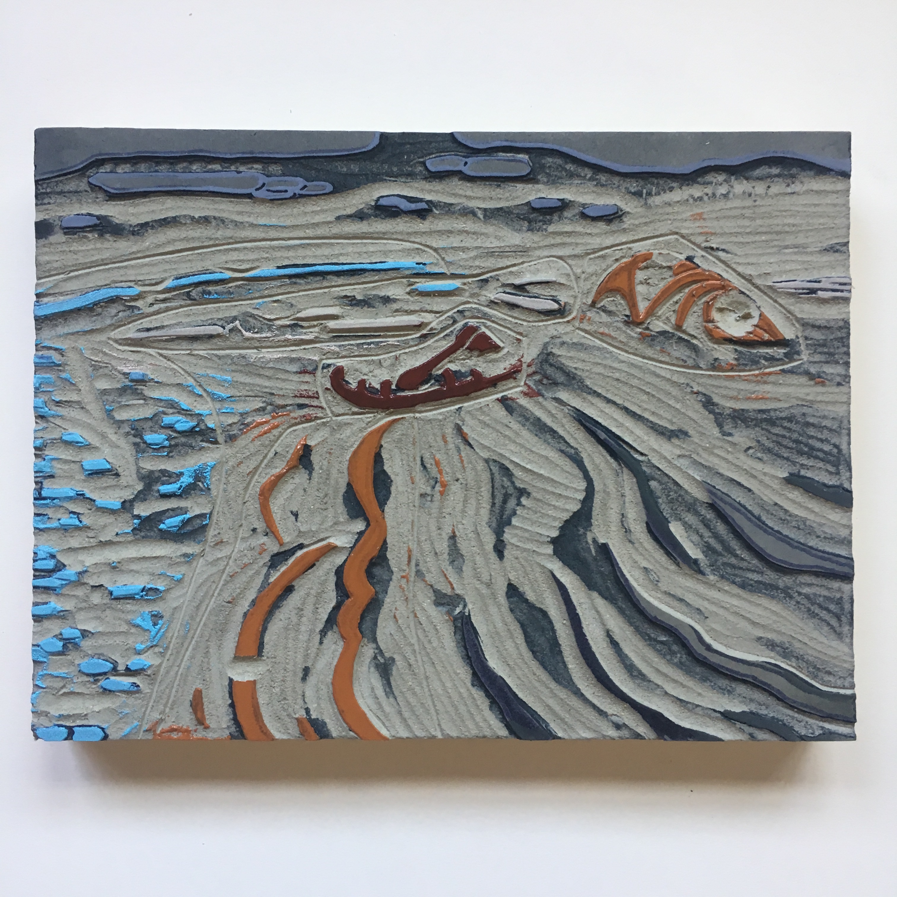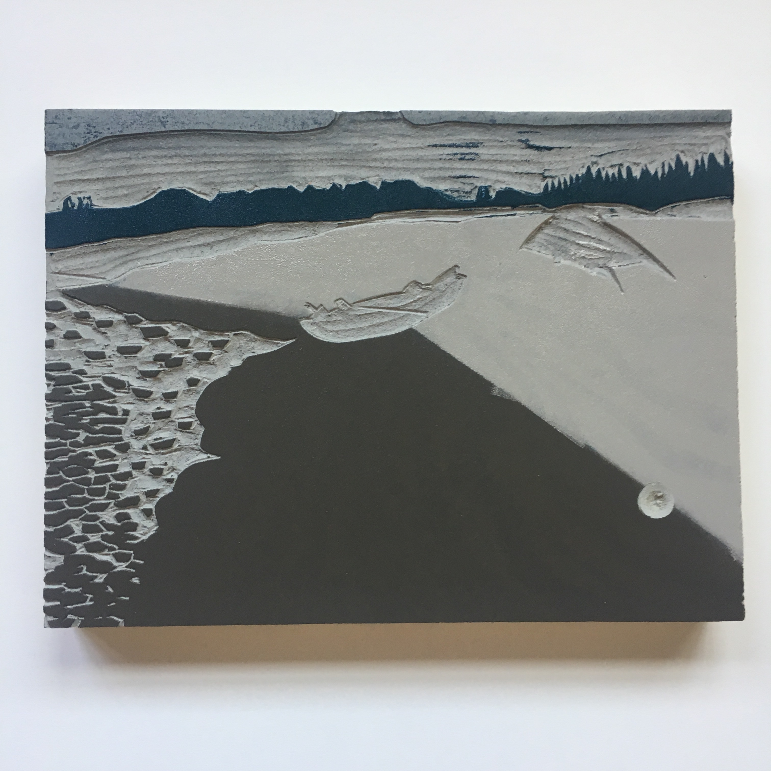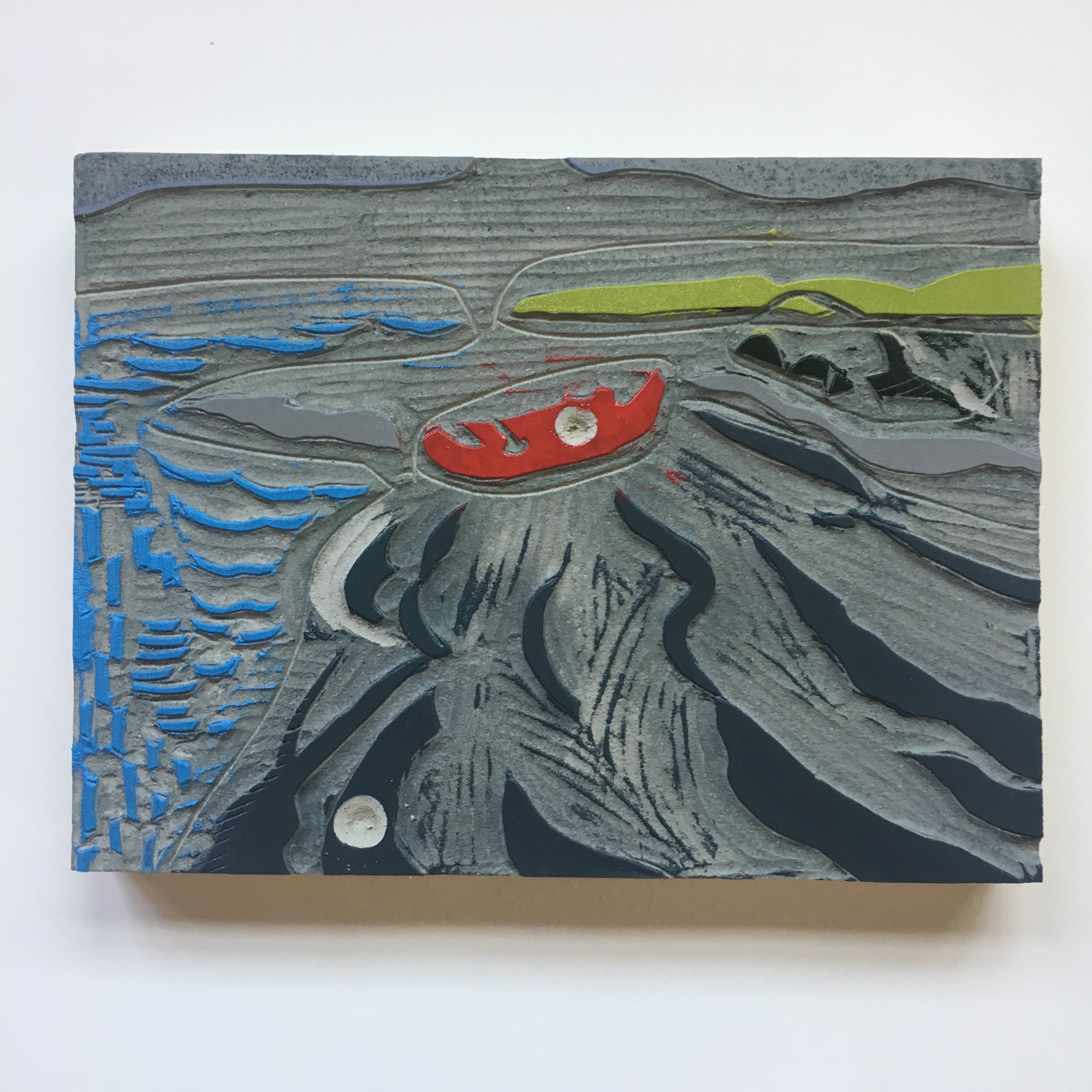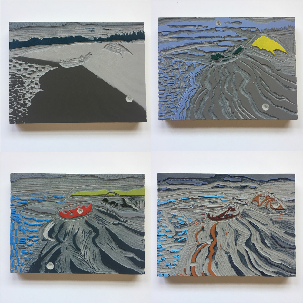 The complete set of 4 hand carved mounted linoleum blocks used to create the print BEACHED - KOBUK N.P. These blocks have been cancelled to prevent further printing.