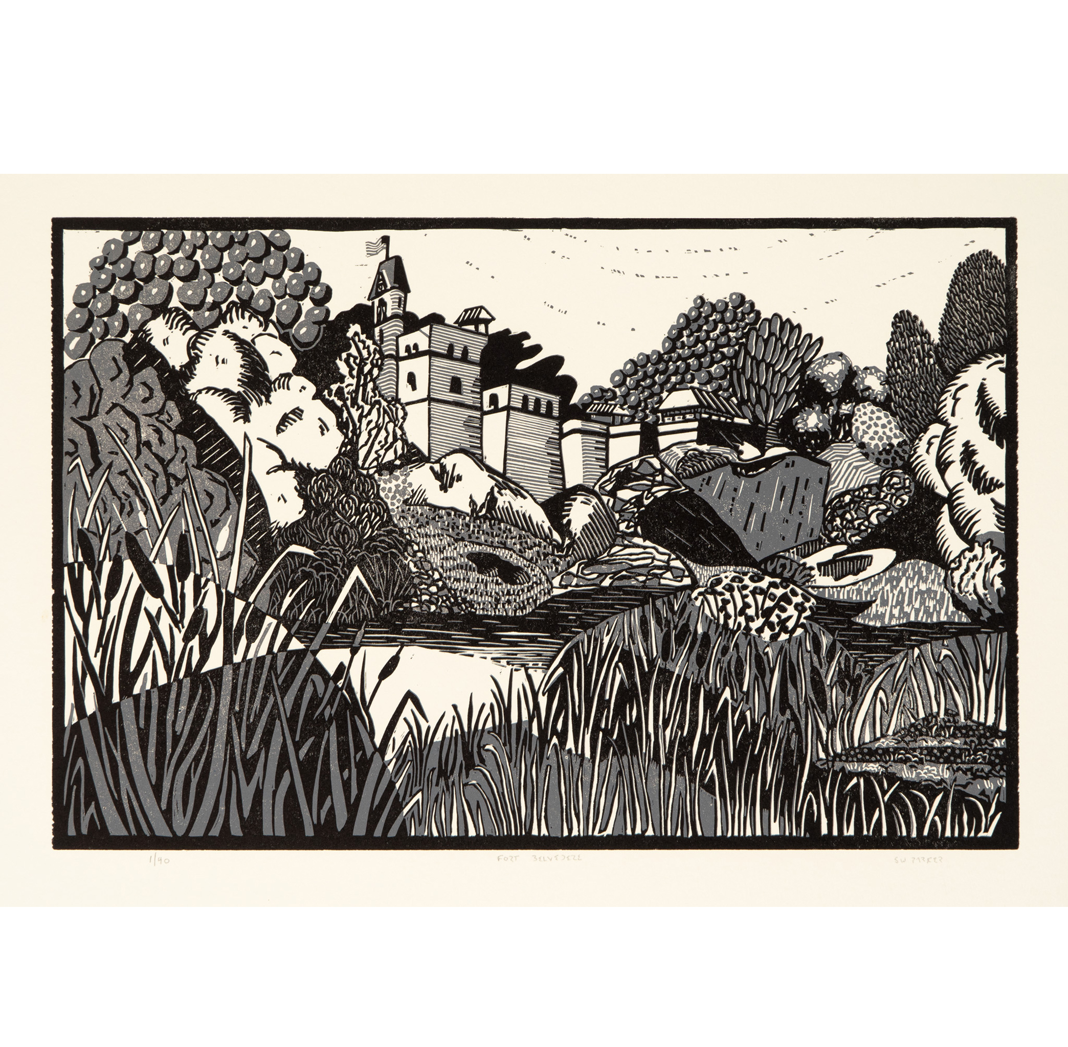FORT BELVEDERE swparker linoleum block print redux in 2 states 12"by18" image size 15"by22" paper size ED : 40