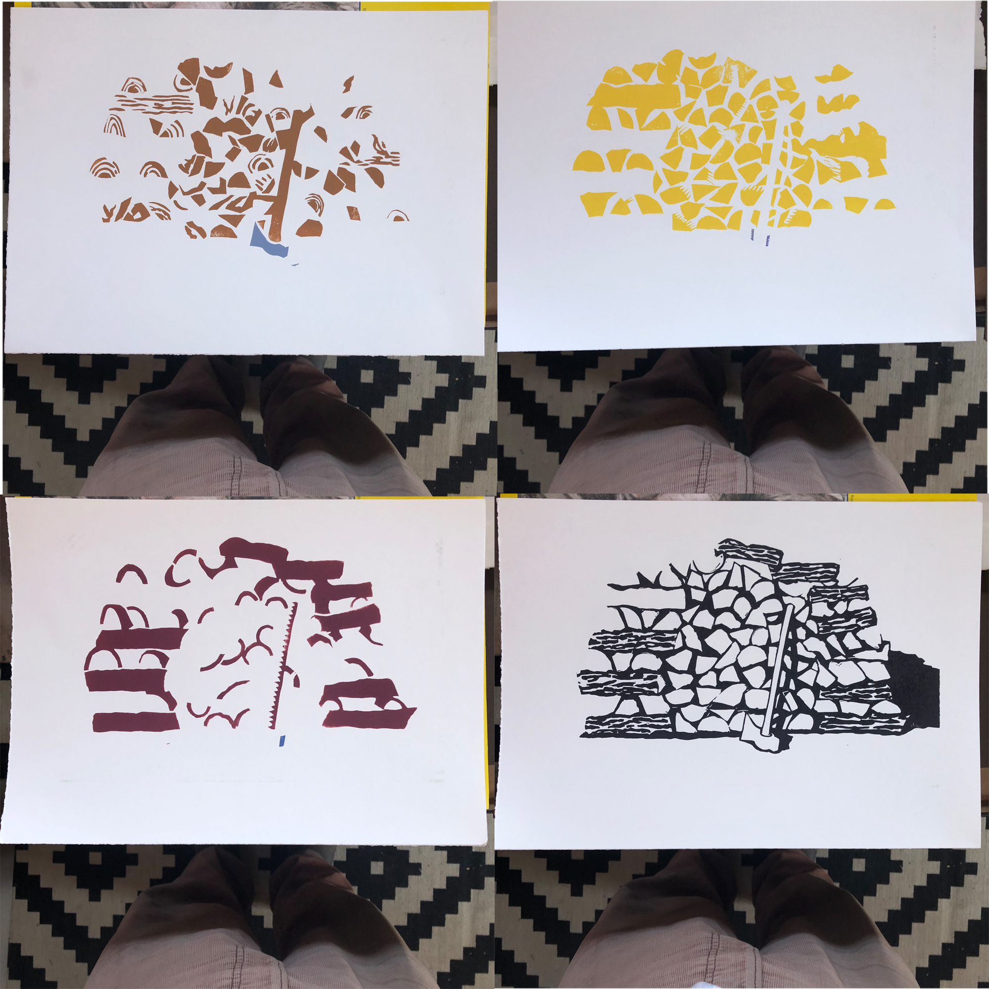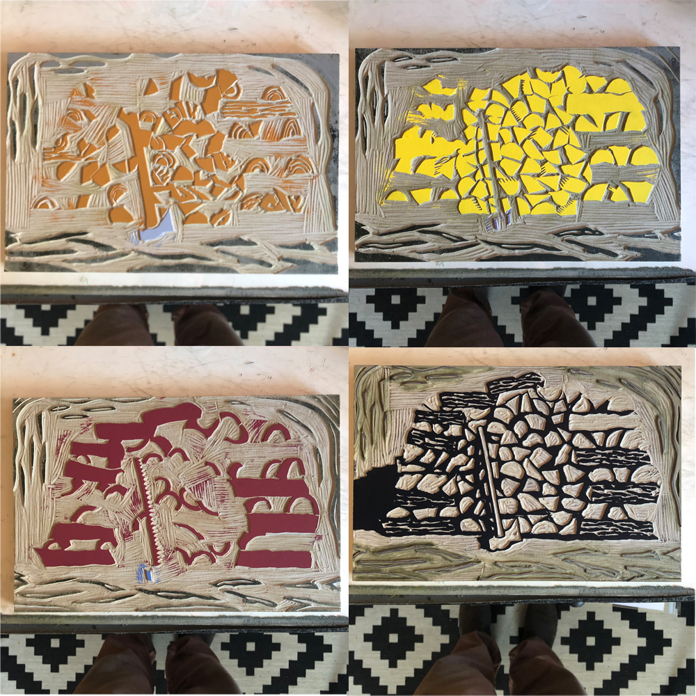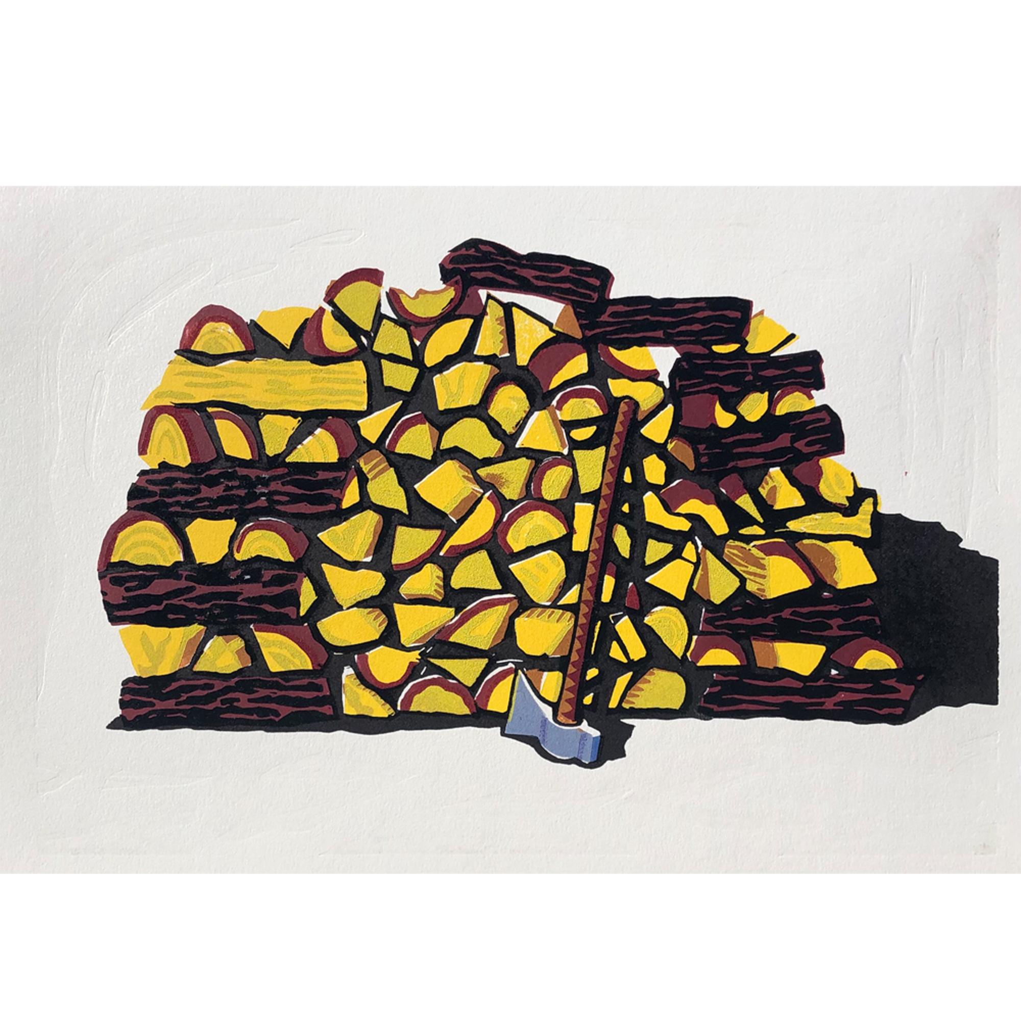 WOODPILE sw parker linoleum block print in 4 states/4 blocks image size 9.5"X14.5" paper size 13" X 18" ED: 40