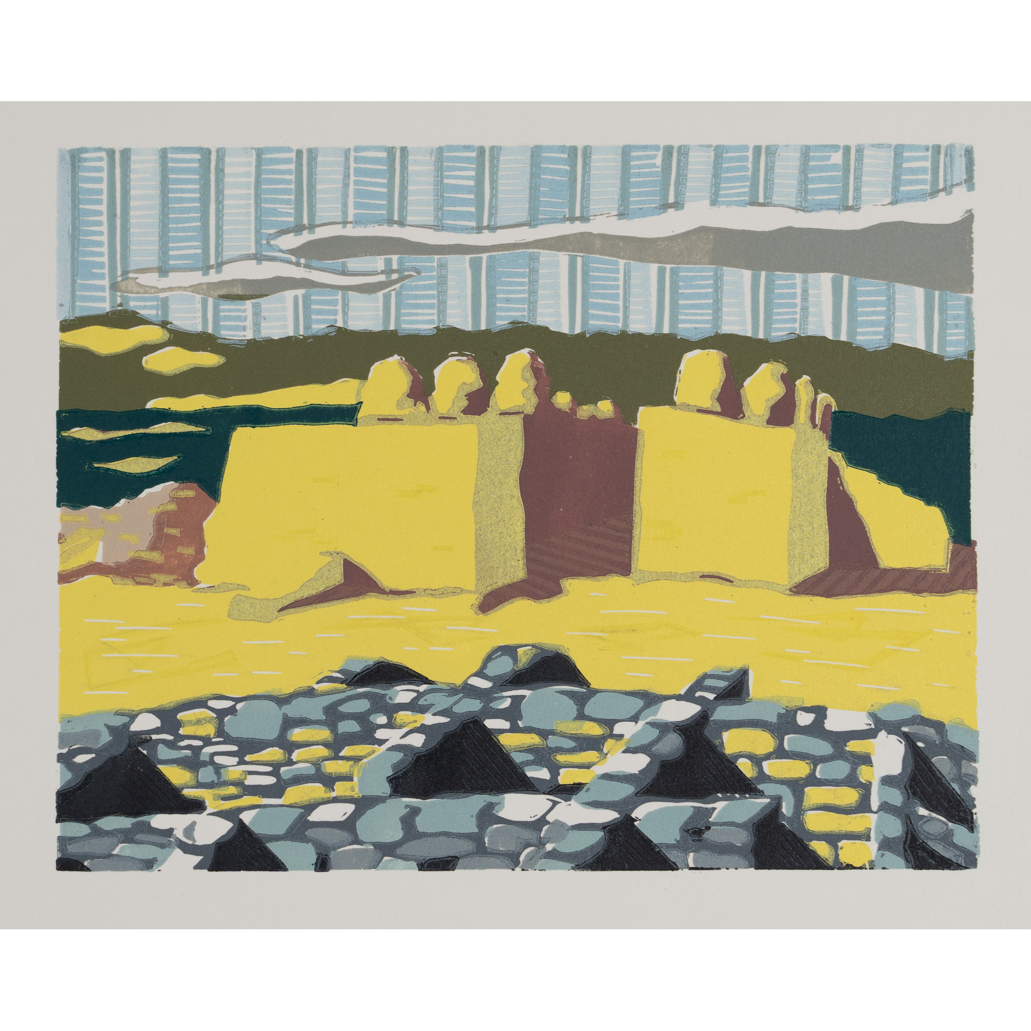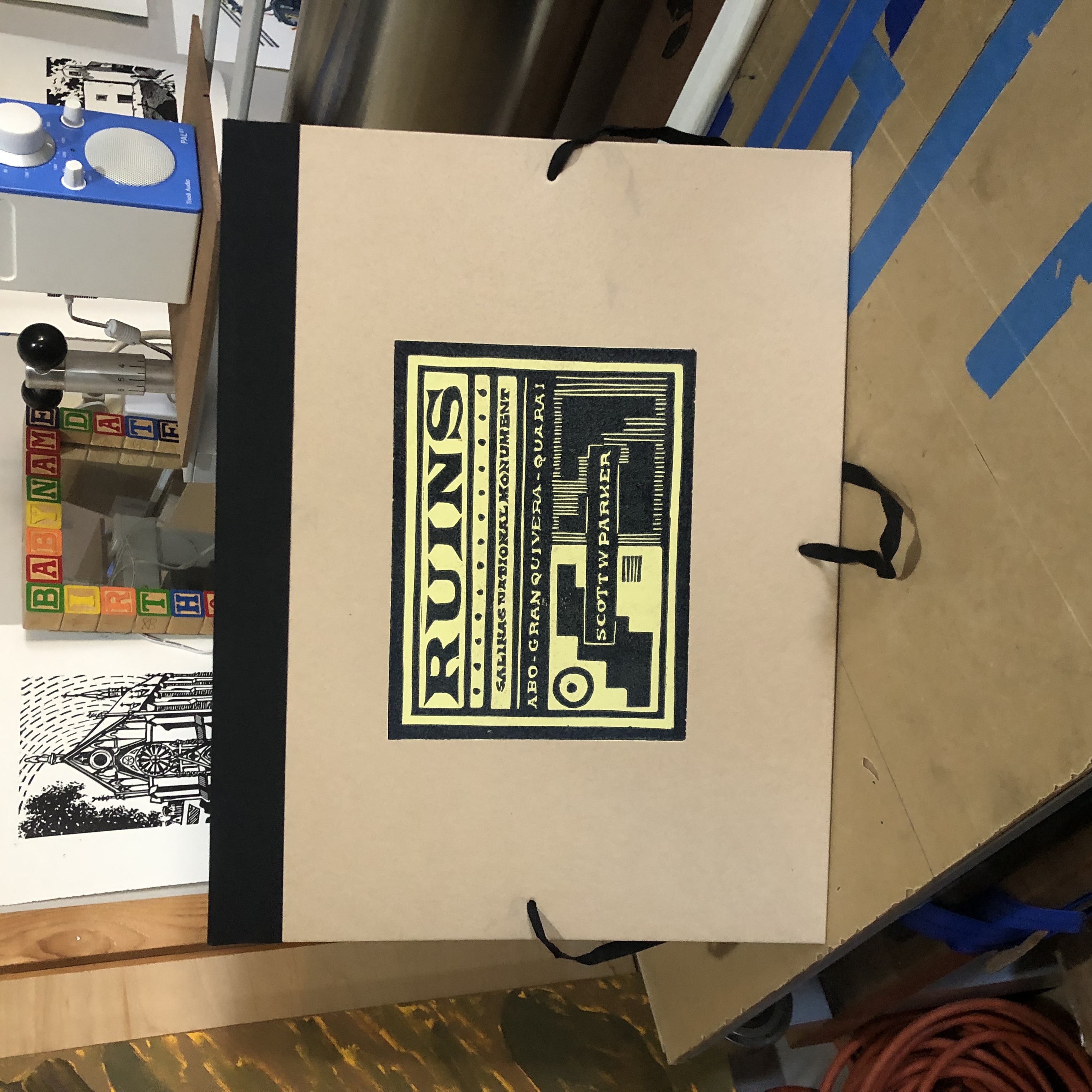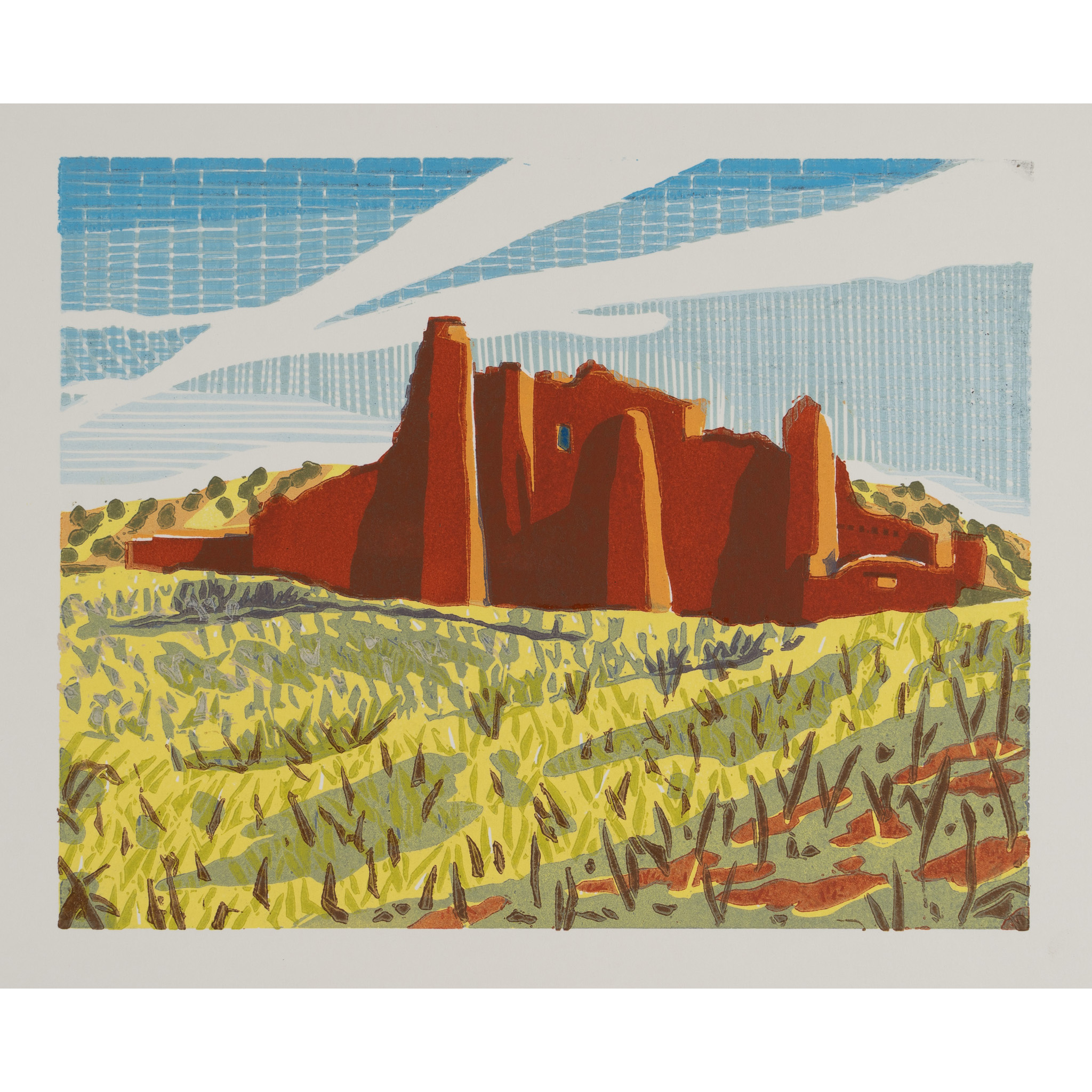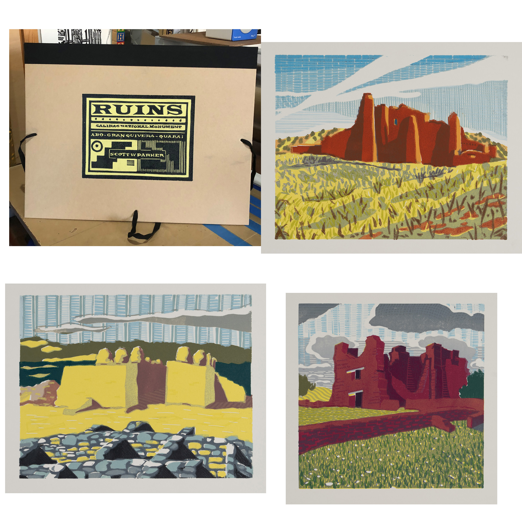 A portfolio containing 3 multiple block linoleum prints of the ruins of salinas national monument; ABO, GRAN QUIVERA, QUARAI