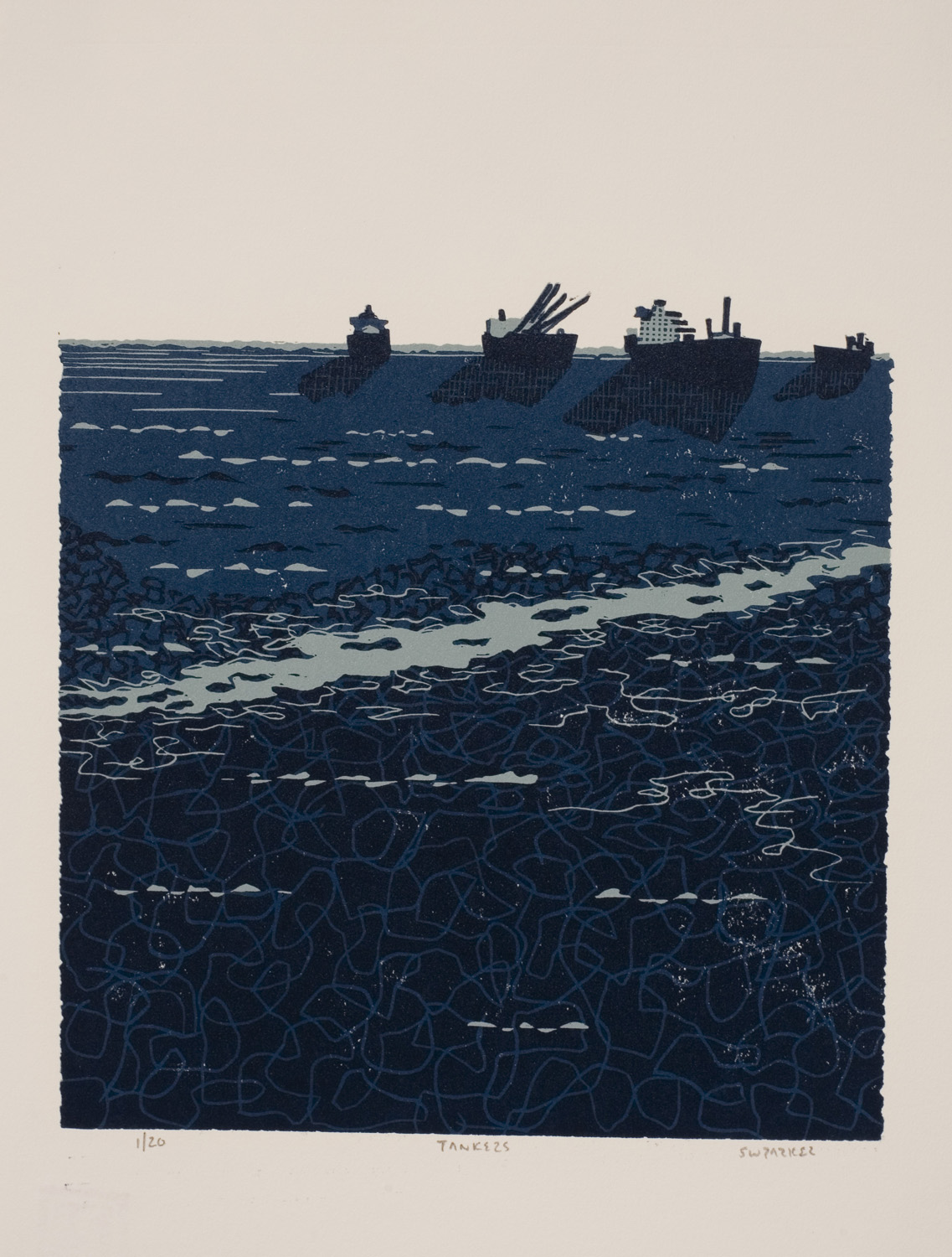 Tankers linoleum block print Redux in 3 states Image size 12 by 9 Paper size 15 by 12 Ed20 2007